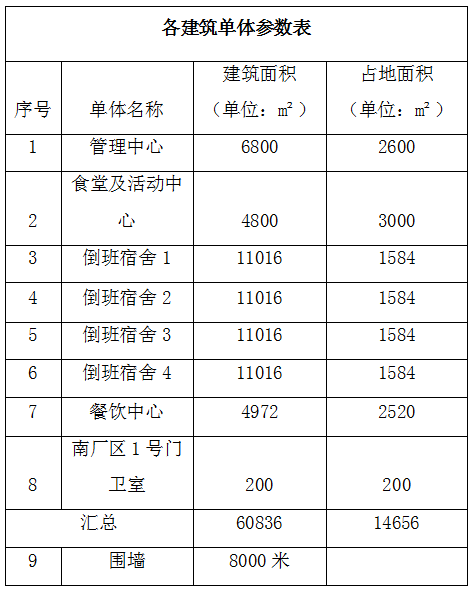 4、采購項目?jì)热莅ǎ汗芾碇行?、食堂及活?dòng)中心、倒班宿舍(暫定四棟)、餐飲中心、南廠(chǎng)區門(mén)衛室、圍墻立面概念設計,各單體參數如下表:
