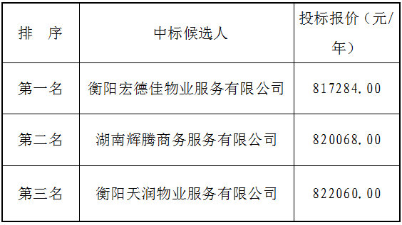 衡陽(yáng)弘湘國有投資(控股)集團有限公司院內物業(yè)服務(wù)采購項目中標候選人公示