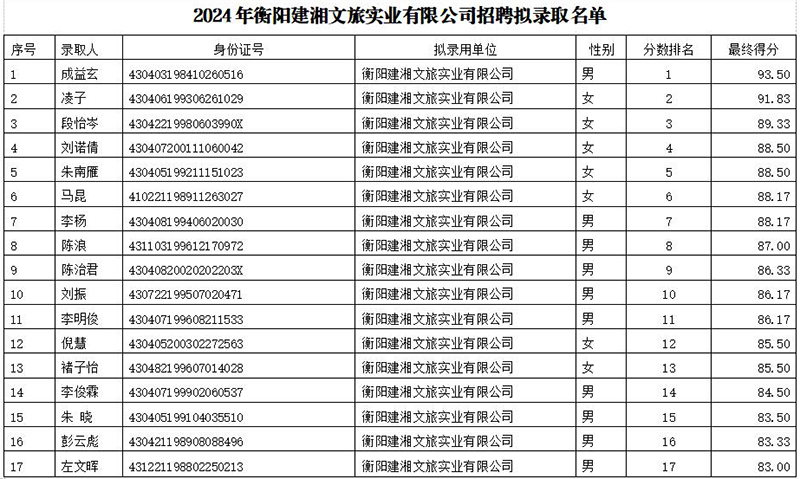 2024衡陽(yáng)建湘文旅實(shí)業(yè)有限公司面向社會(huì )公開(kāi)招聘擬錄取人員名單公示