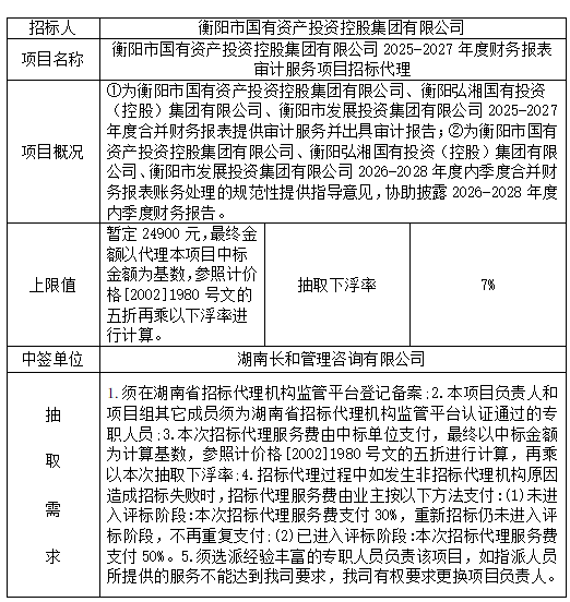 衡陽(yáng)市國有資產(chǎn)投資控股集團有限公司2025-2027年度財務(wù)報表審計服務(wù)項目招標代理抽取結果公示